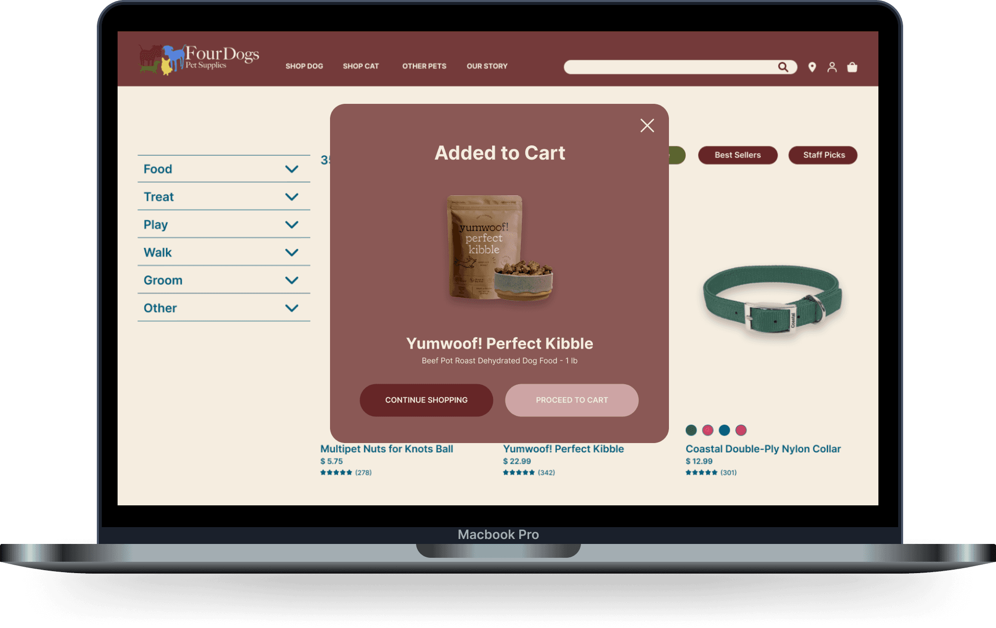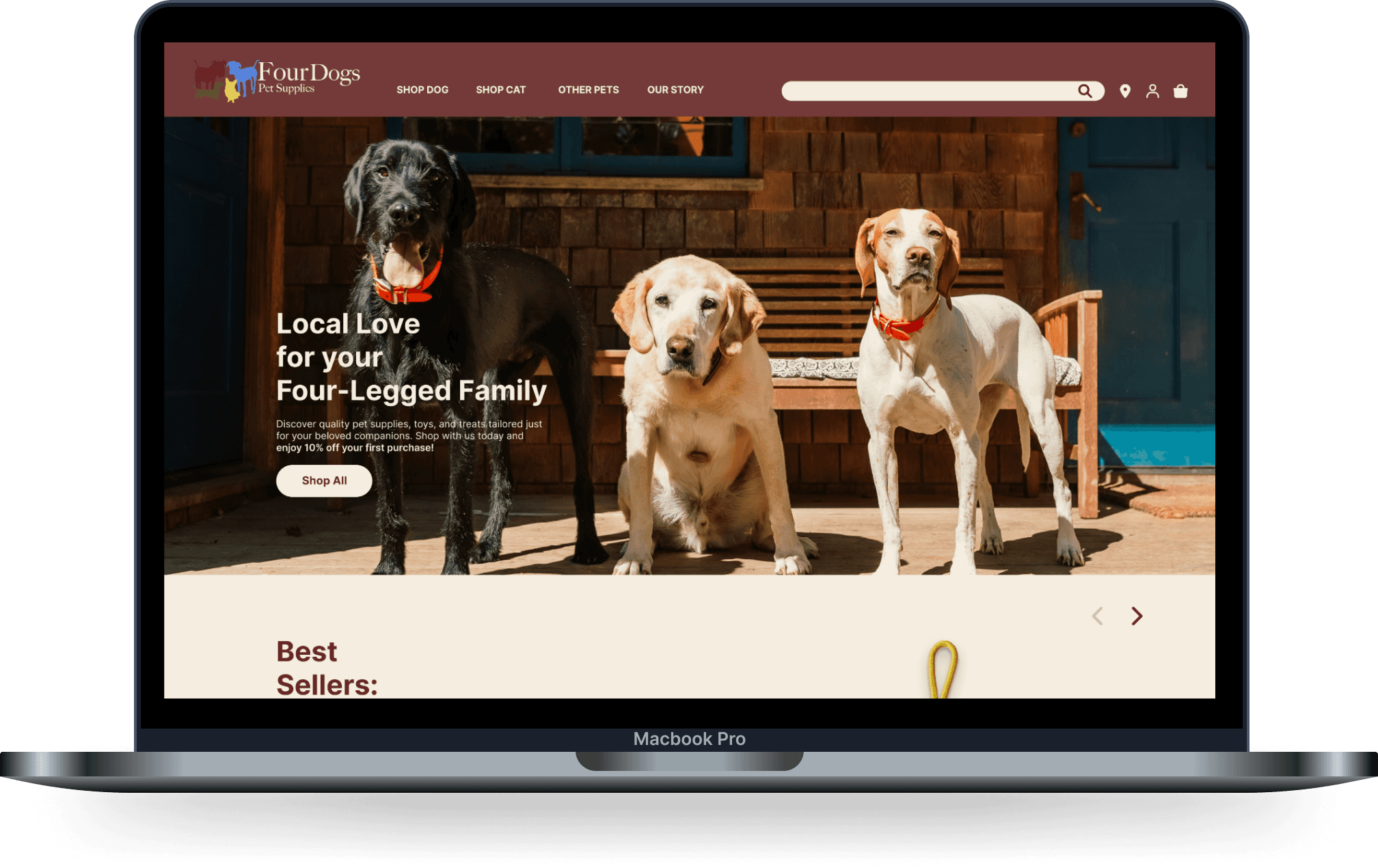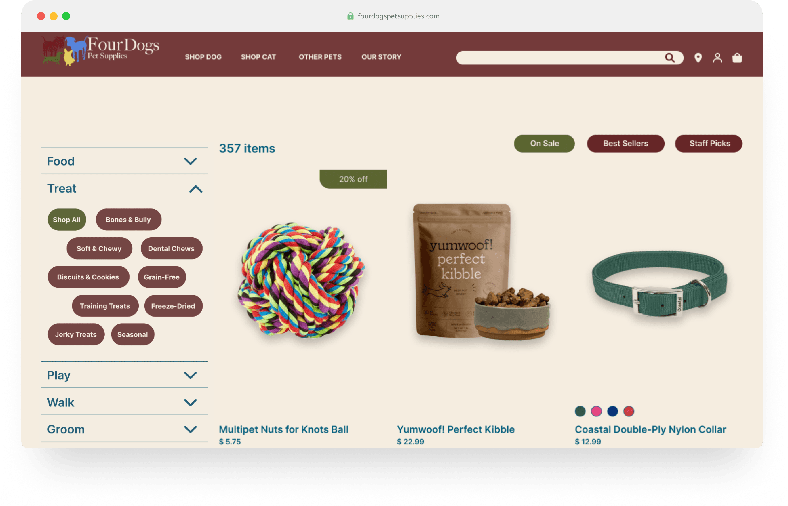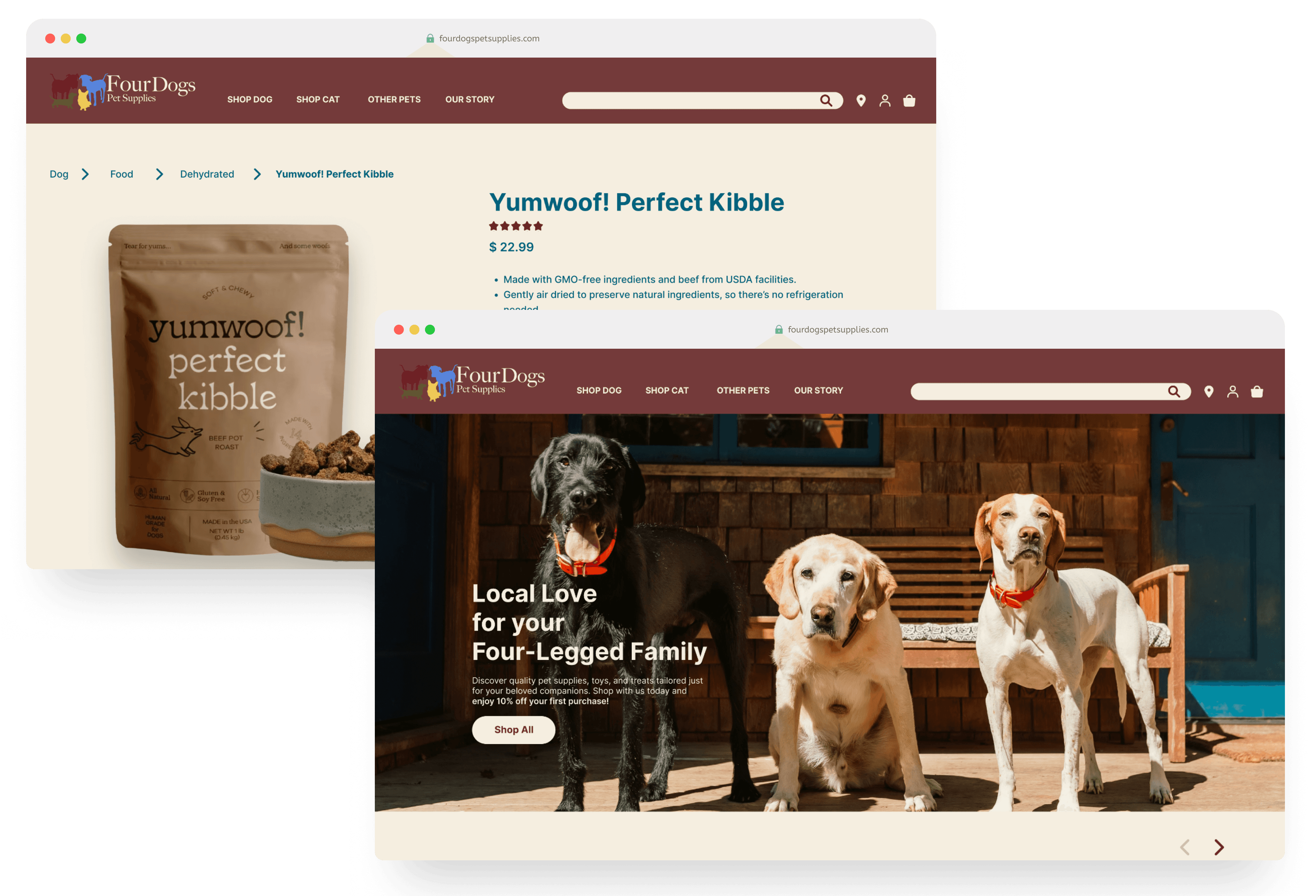 Recognizing the disconnect, my goal was to create a seamless and inviting digital experience that reflected the heart of Four Dogs Pet Supplies. Through thorough research, iterative design, and usability testing, I transformed the e-commerce site into a user-friendly extension of Betsy’s mission, ensuring her customers felt as valued online as they did in-store.