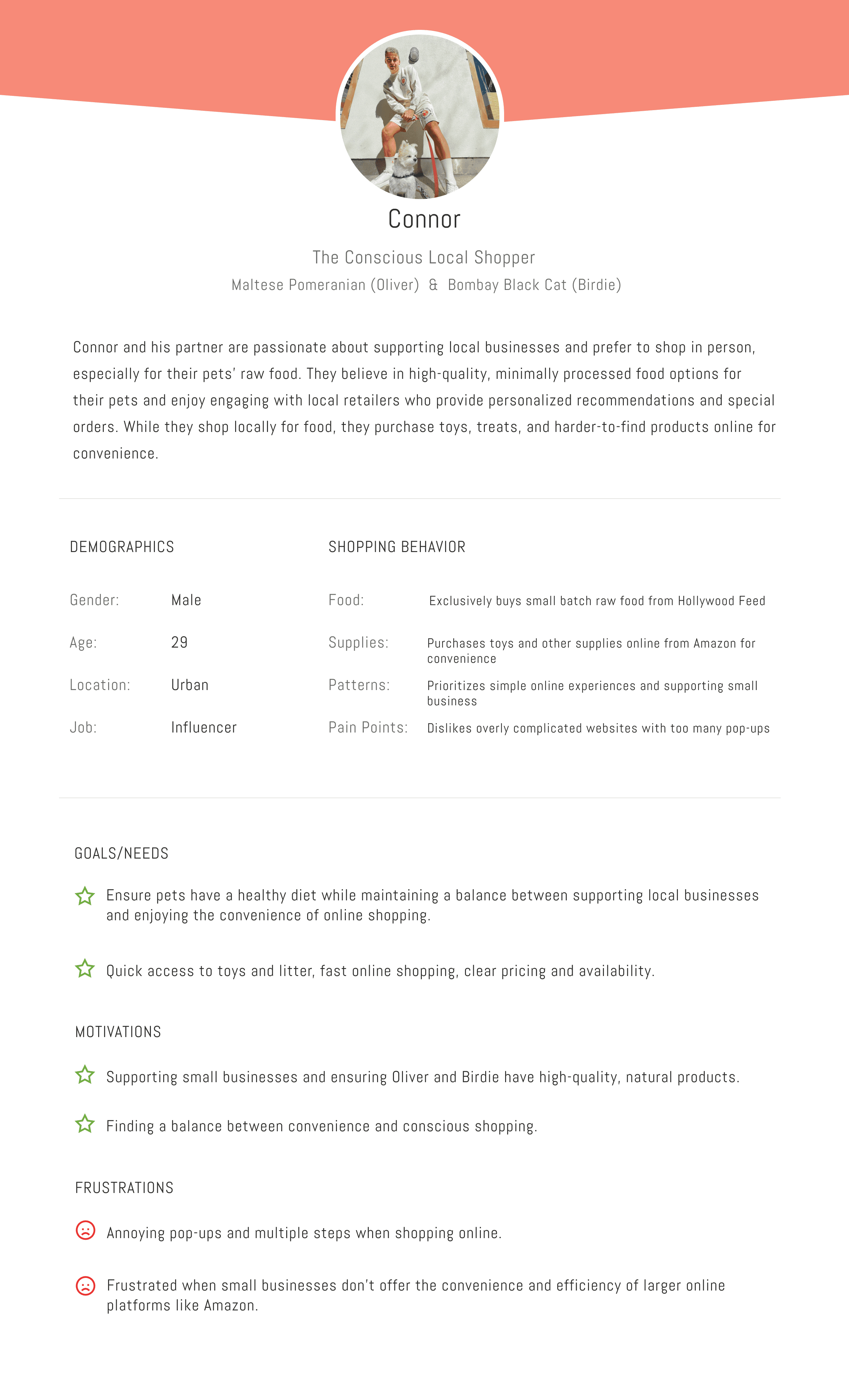 Meet Connor, a busy professional and devoted pet owner who values supporting local businesses. He relies on trusted recommendations for his pet’s health and prefers shopping at Four Dogs for its personalized in-store experience. However, Connor’s packed schedule often forces him to shop online, where he feels frustrated by confusing navigation and the lack of clear product information.