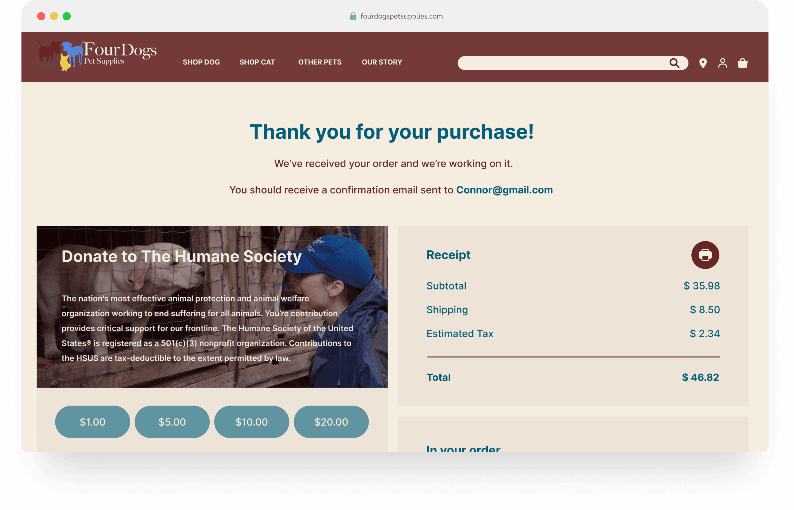 The final design integrates features that reflect Four Dogs' community-driven ethos. By enabling donations to the Humane Society at checkout, the redesign brings the spirit of the brick-and-mortar store online, fostering a deeper connection between the brand and its customers. This addition not only supports animal welfare but also strengthens the shared values and trust that define the Four Dogs experience.