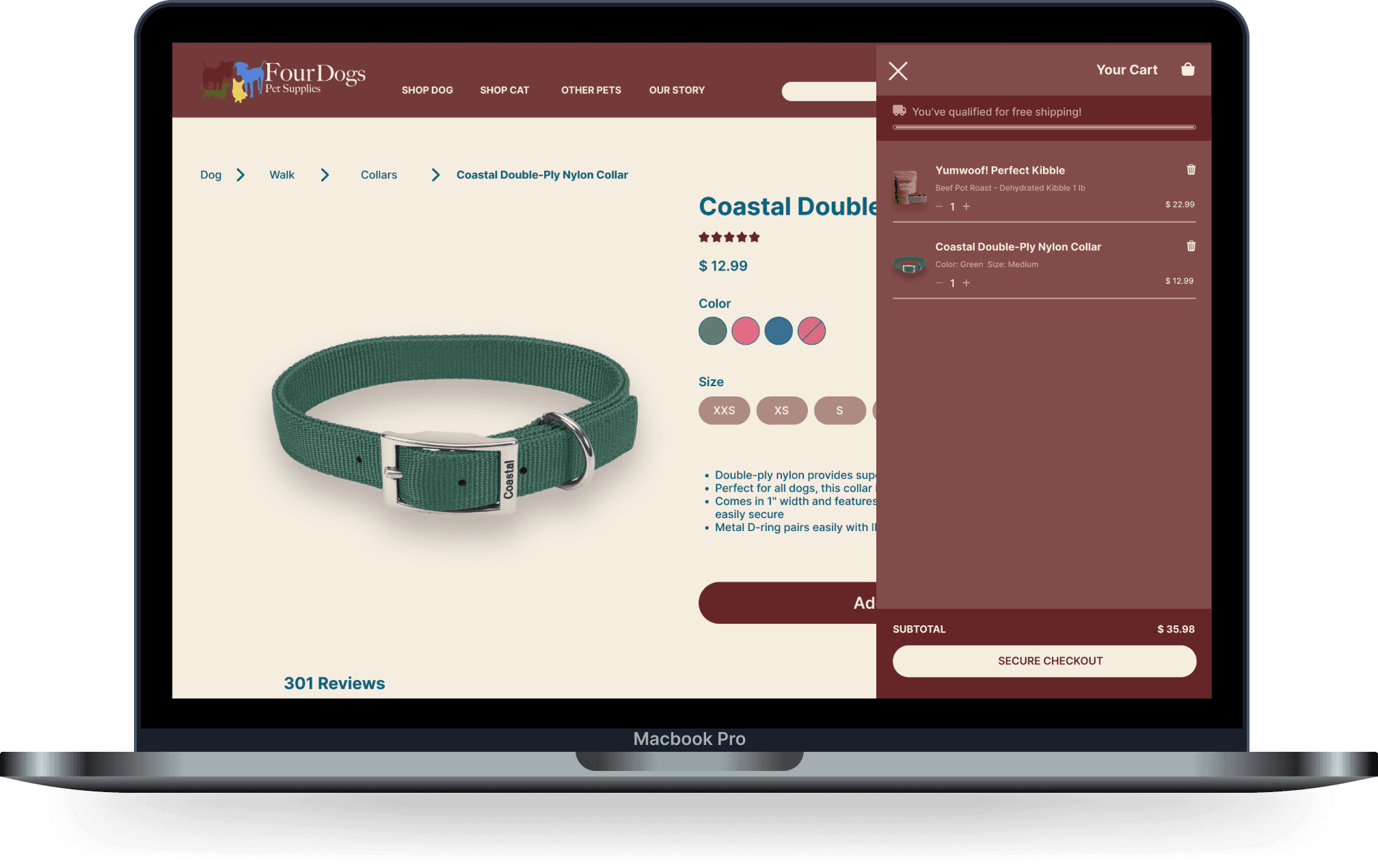Caloric information, quick ingredient access, and detailed customer reviews build transparency and confidence. Reviews now include dog breed, size, and ratings, helping users find the best products for their pets while reinforcing trust in Four Dogs Pet Supplies.